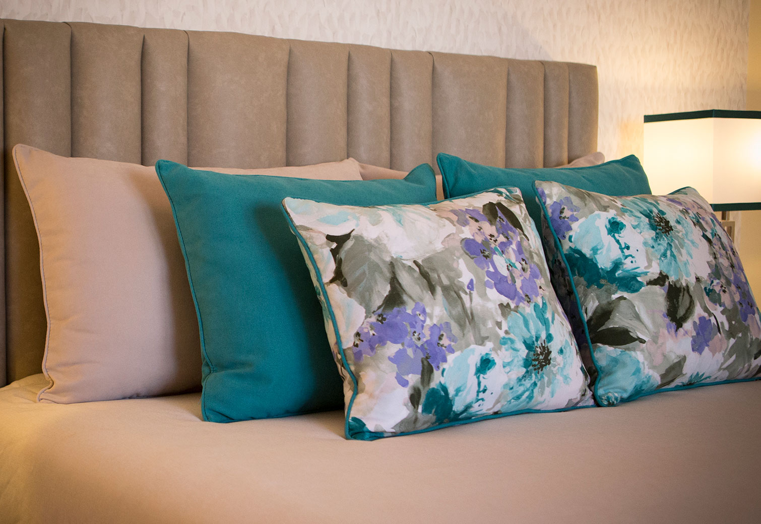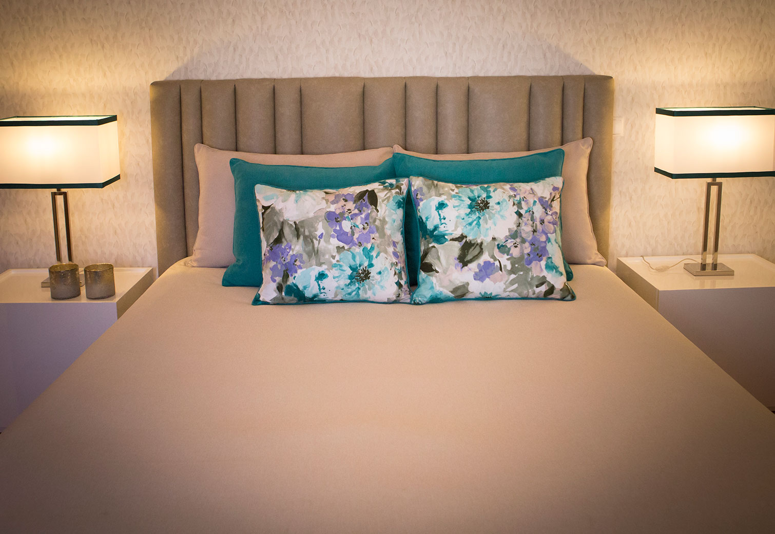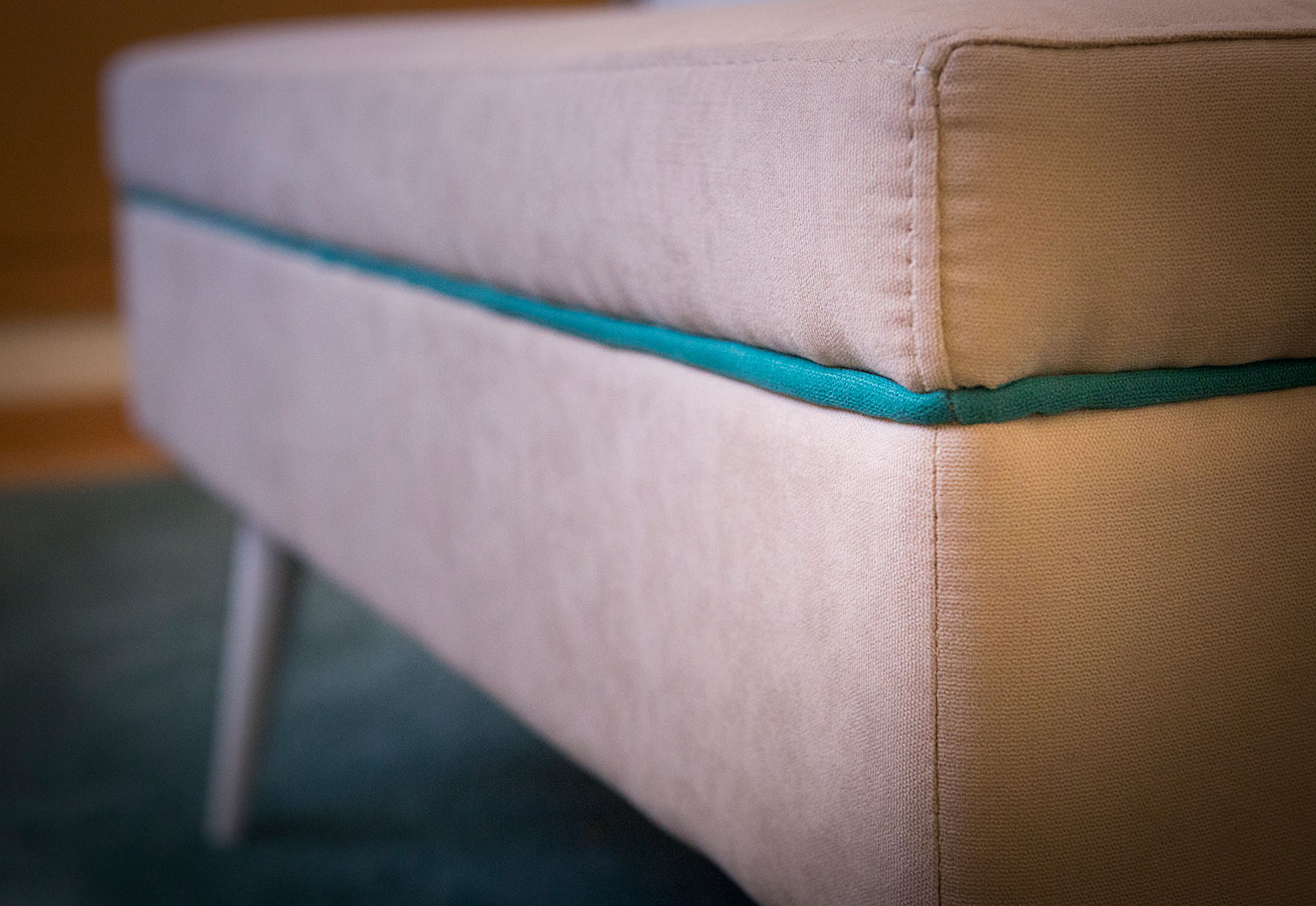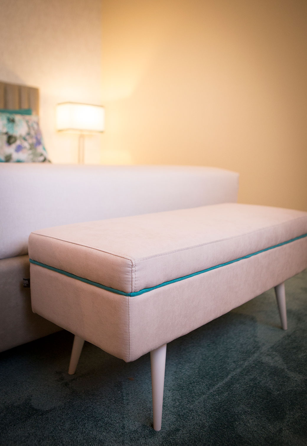 No quarto da Susana e do José pode encontrá-lo nas almofadas, abajures e banco de apoio.