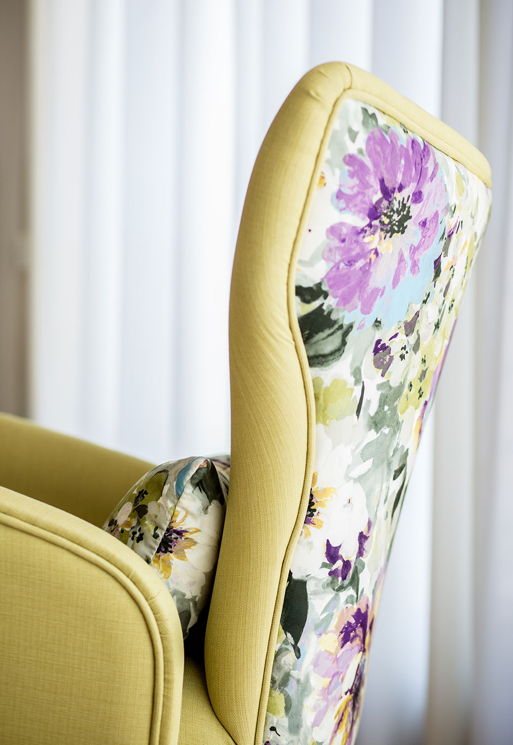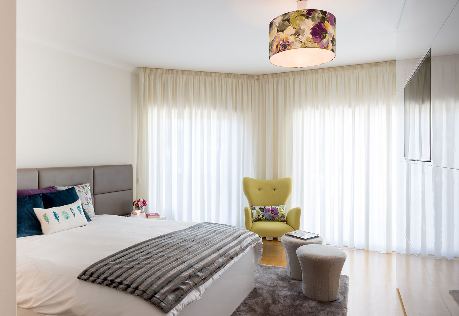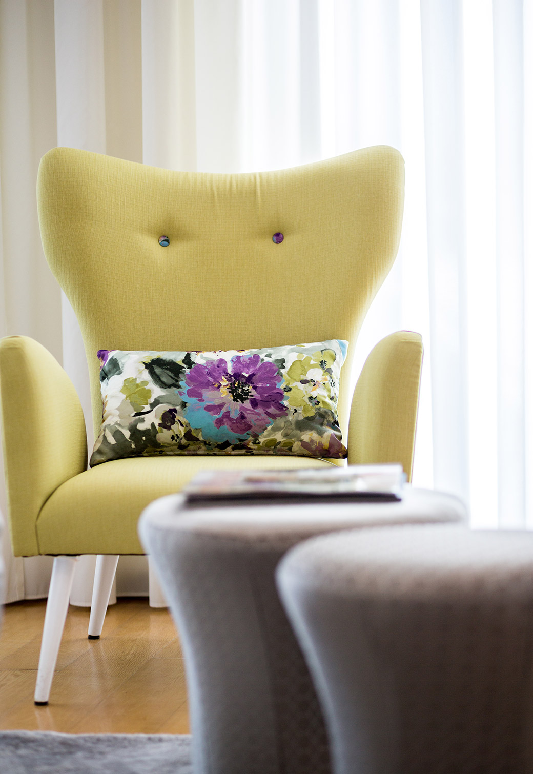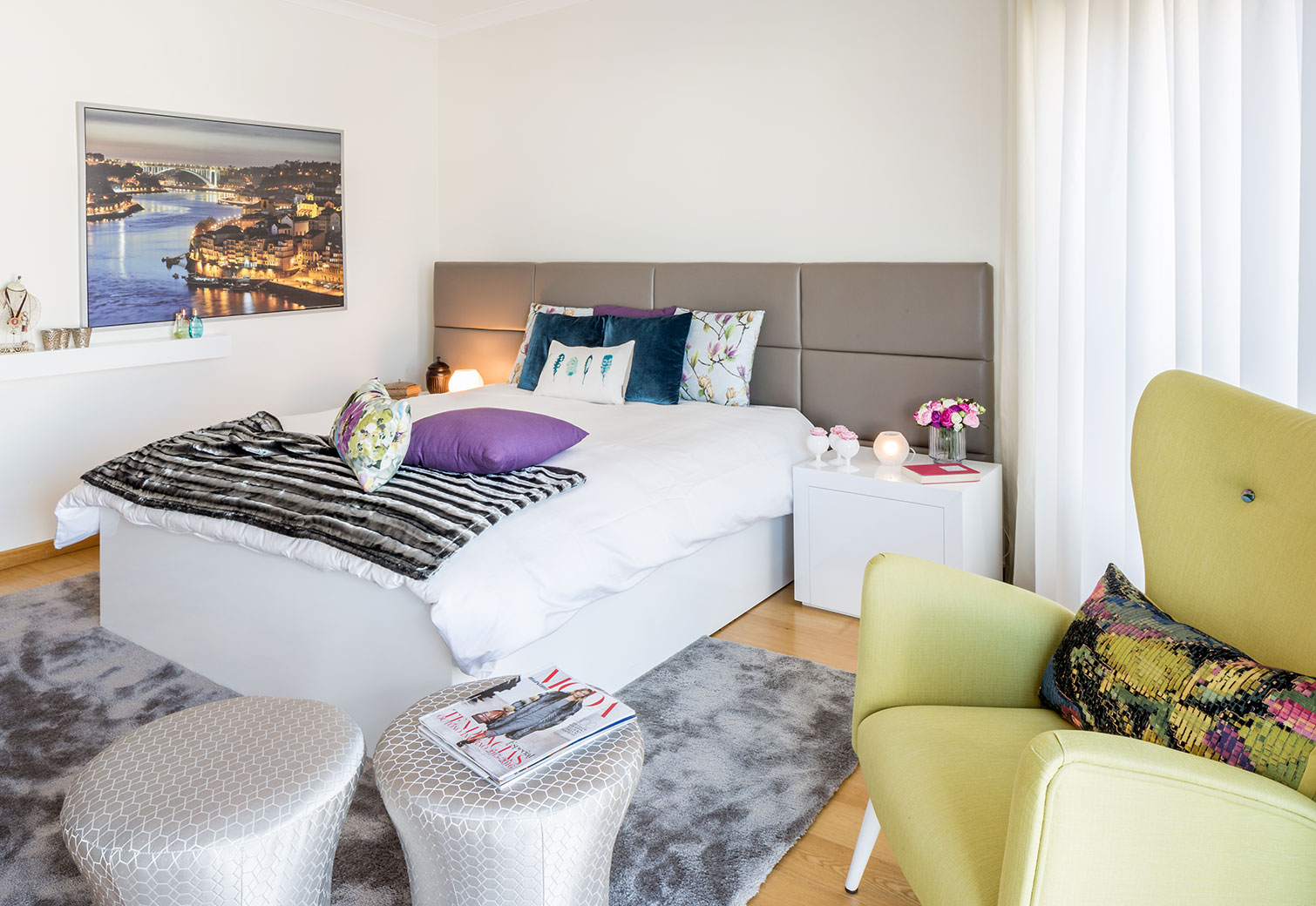 Do cadeirão com o botão igual às costas, passando pelas almofadas de cama com cores e tons a combinar com o arranjo da mesa de cabeceira, nada foi deixado ao acaso.